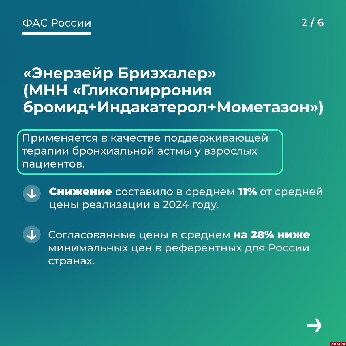 50% от средней стоимости реализации в 2024 году; 52% от минимальных цен в референтных для России странах. Фото: ФАС России/ Telegram-канал Снижение стоимости препаратов повысит их доступность для граждан России. В медорганизациях они должны предоставляться гражданам бесплатно в рамках программы государственных гарантий бесплатного оказания медицинской помощи. Источник: Псковская Лента НовостейПоследние новости