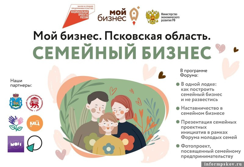 Форум «Мой бизнес. Псковская область. Семейный бизнес» пройдёт в рамках V Форума молодых семей в Пскове 13 июля, сообщили ПАИ в пресс-службе регионального правительства.