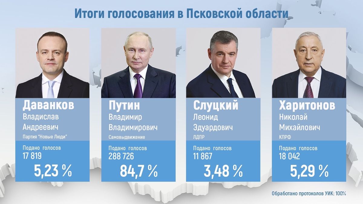 Фото: Облизбирком Владимир Путин по результатам обработки 100% бюллетеней в Псковской области набрал 84,7% голосов на выборах президента.