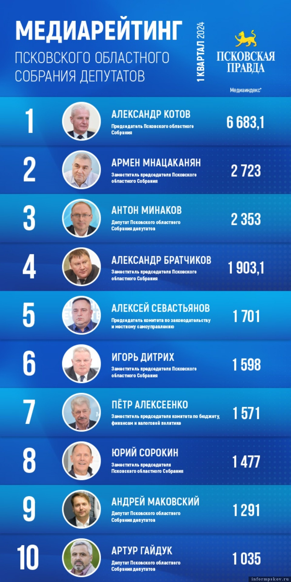Пять вице-спикеров Псковского облсобрания вошли в топ-15 медиарейтинга «Псковской правды»