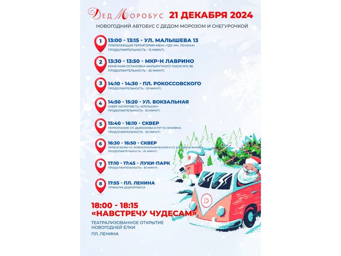 Сегодня, 21 декабря, с 13:00 до 17:55 по городу Великие Луки будет курсировать праздничный "ДедМоробус"!