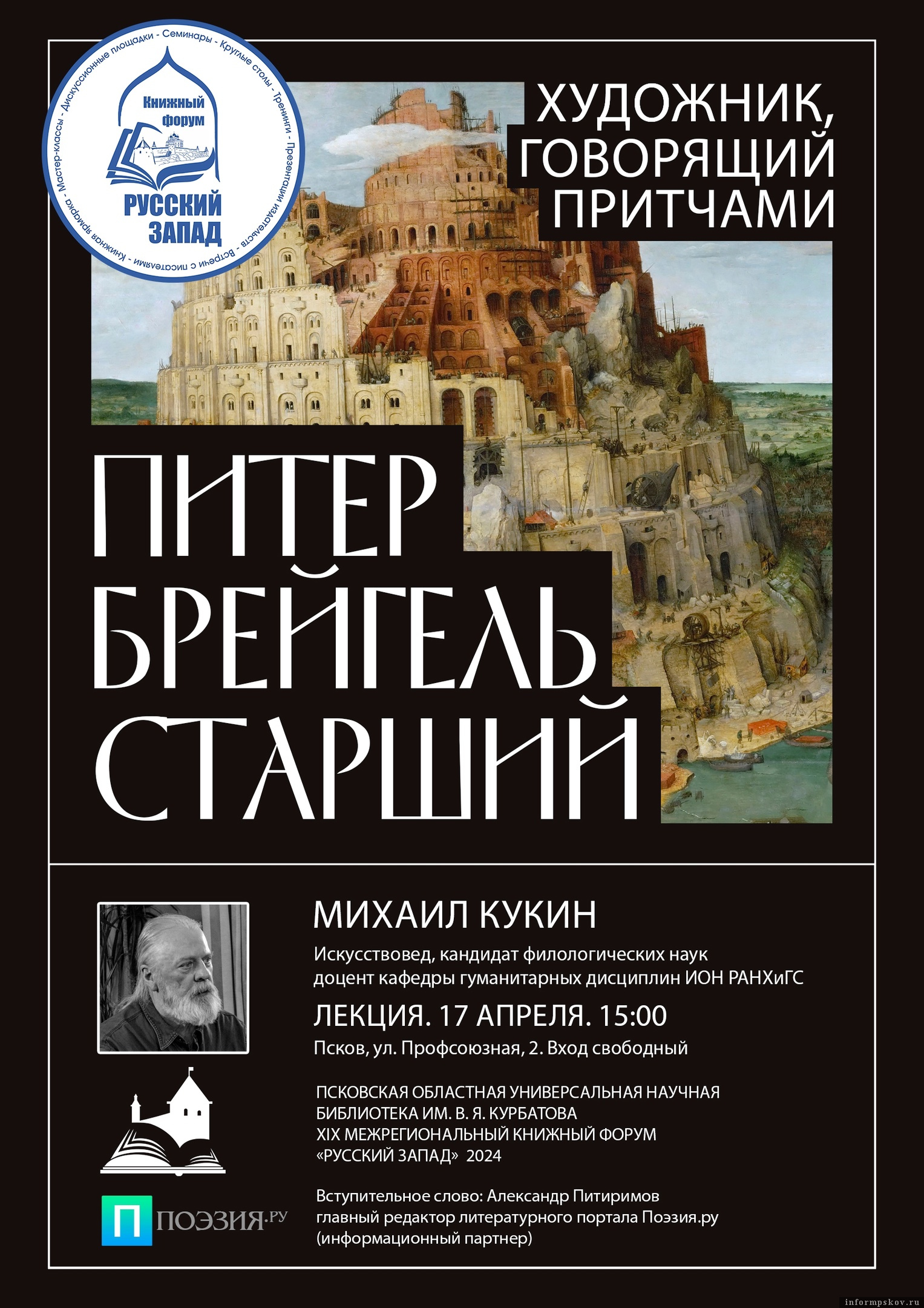 Авторская лекция филолога, историка искусства, кандидата филологических наук, доцента ИОН РАНХиГС Михаила Кукина о «визуальной притче» в творчестве Брейгеля пройдёт на площадке Псковской областной универсальной научной библиотеки имени В. Я. Курбатова 17 апреля. Об этом ПАИ сообщили организаторы.