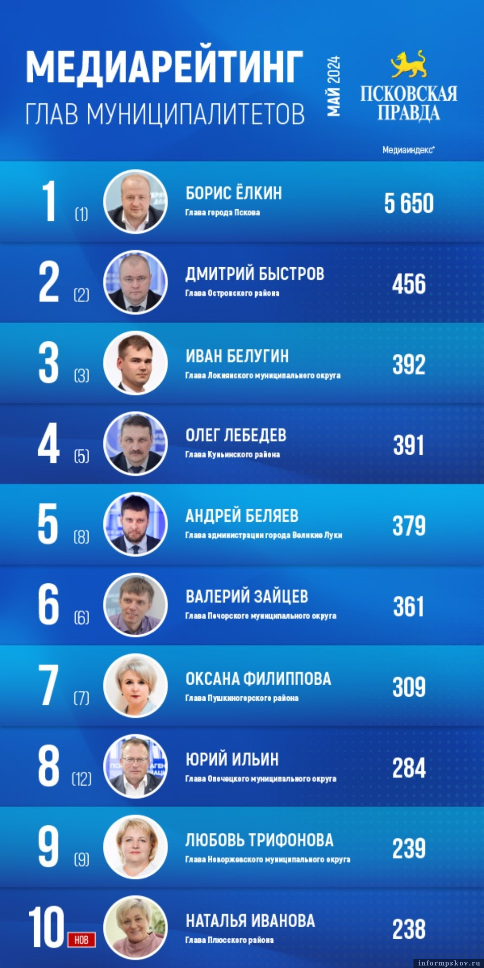 Глава Плюсского района Наталья Иванова, глава Усвятского района Дмитрий Петров и глава Стругокрасненского муниципального округа Александр Волков впервые попали в топ-15 рейтинга глав муниципалитетов Псковской области. Рейтинг за май 2024 года составила «Псковская правда» на основе данных СМИ из системы «Медиалогия».