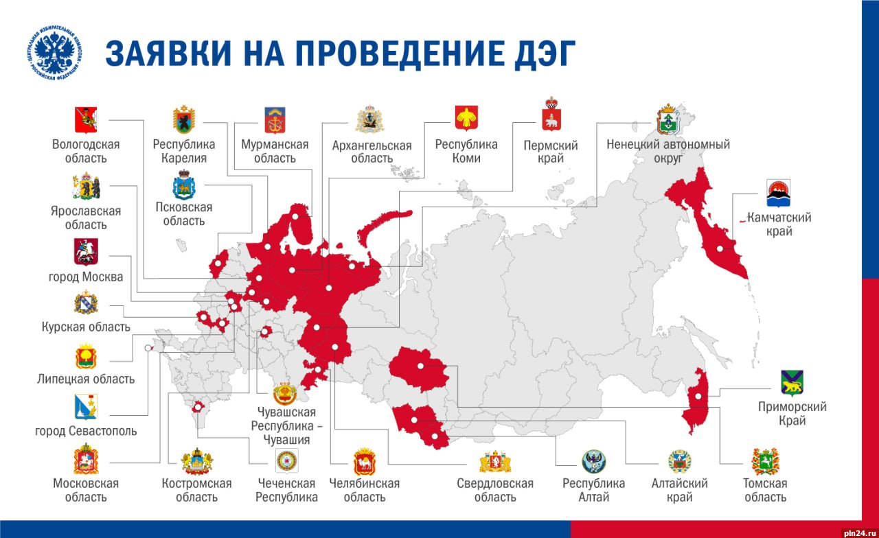 Всего заявки на проведение ДЭГ в ЕДГ-2024 поступили из 23 регионов, в их числе Республики Алтай, Карелия, Коми, Чеченская Республика, Чувашская республики, Алтайский, Камчатский, Пермский и Приморский край, Архангельская, Вологодская, Костромская, Курская, Липецкая, Московская, Мурманская, Псковская, Свердловская, Томская, Челябинская и Ярославская области, Севастополь и Ненецкий автономный округ. Кроме того, предполагается проведение ДЭГ на региональной платформе в Москве.
