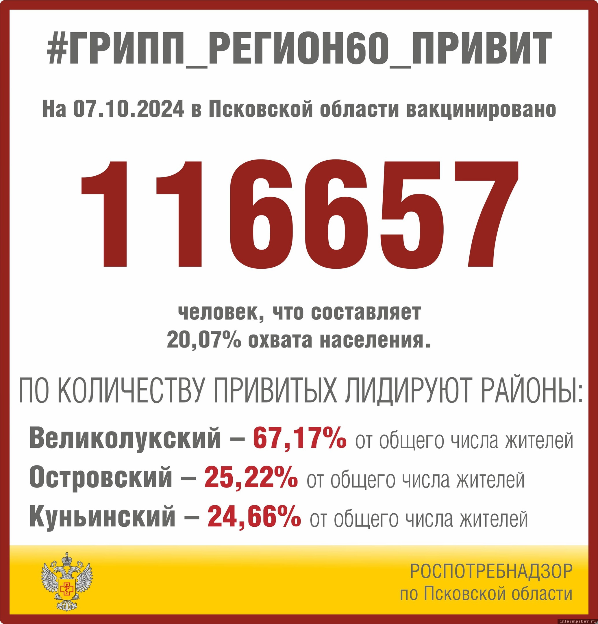 116 657 человек вакцинировались от гриппа в Псковской области, сообщили ПАИ в региональном управлении Роспотребнадзора.